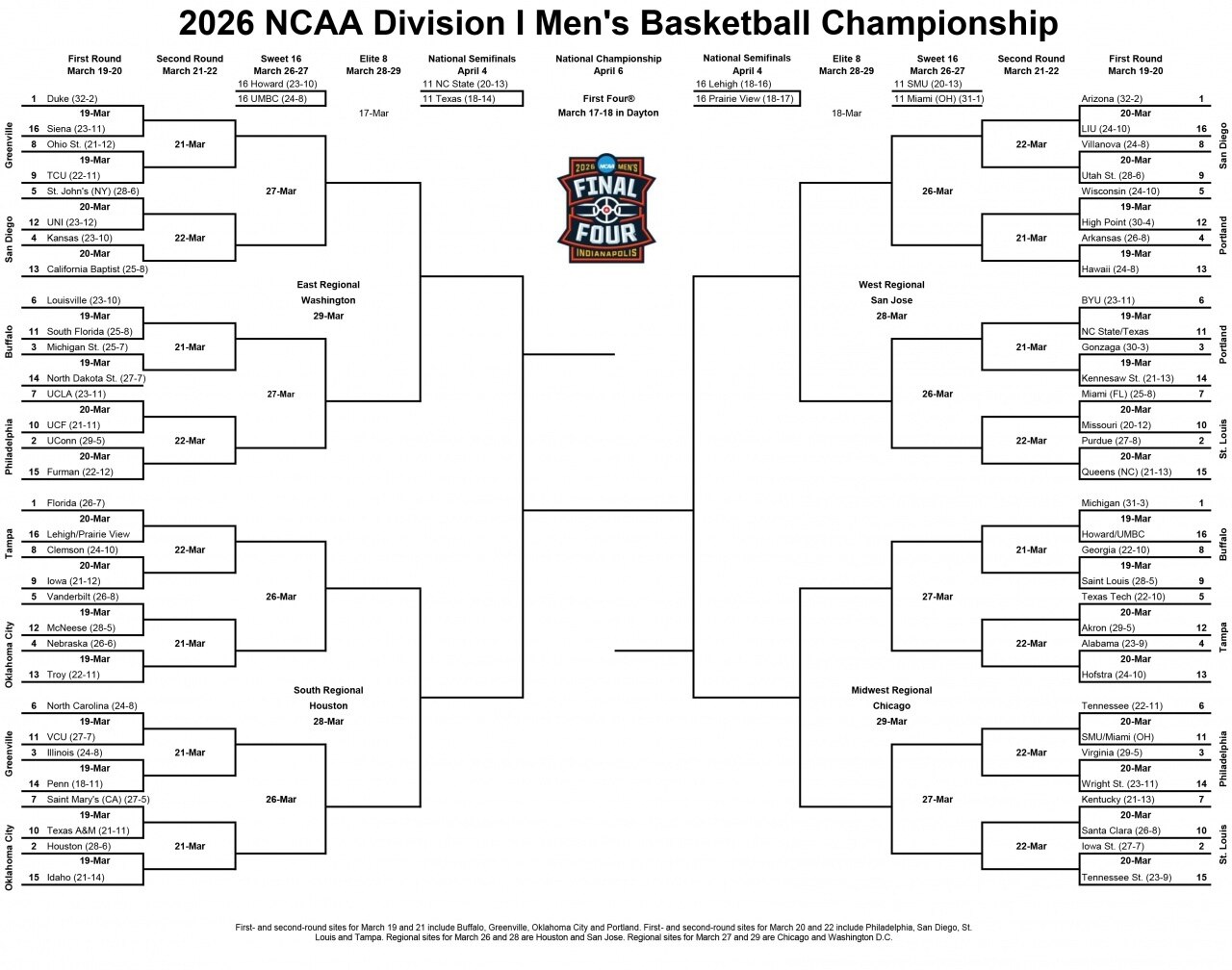 According to the schedule confirmed by the lottery yesterday, "March Madness" 2026 will officially start on March 18 (tomorrow) Beijing time. 68 college teams that have secured their spots through months of regular-season battles will compete for the championship, beginning with the First Four play-in games. Eight play-in teams will directly eliminate 4 teams, and the remaining 64 teams will determine the final winner through five rounds of single-elimination (64 teams → 32 teams → Sweet 16 → Elite 8 → Final 4 → Championship Game → National Champion).