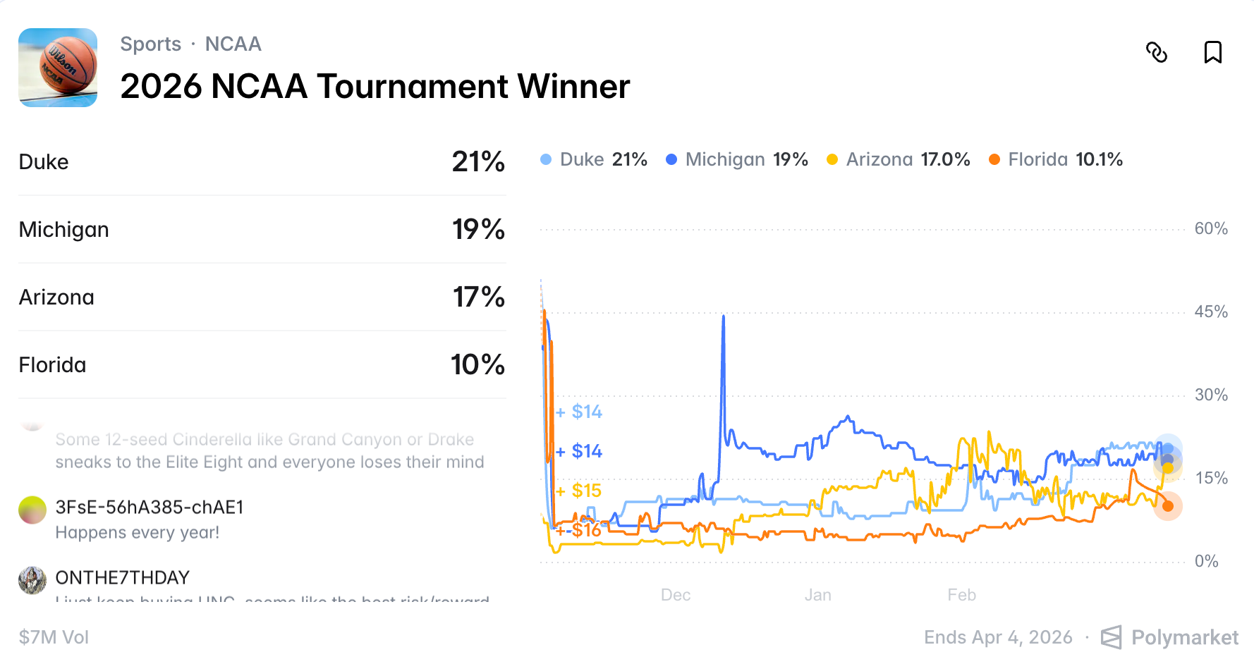 Polymarket's real-time odds show that the top four college teams currently favored to win "March Madness" are the number one seeds from the four major regions: