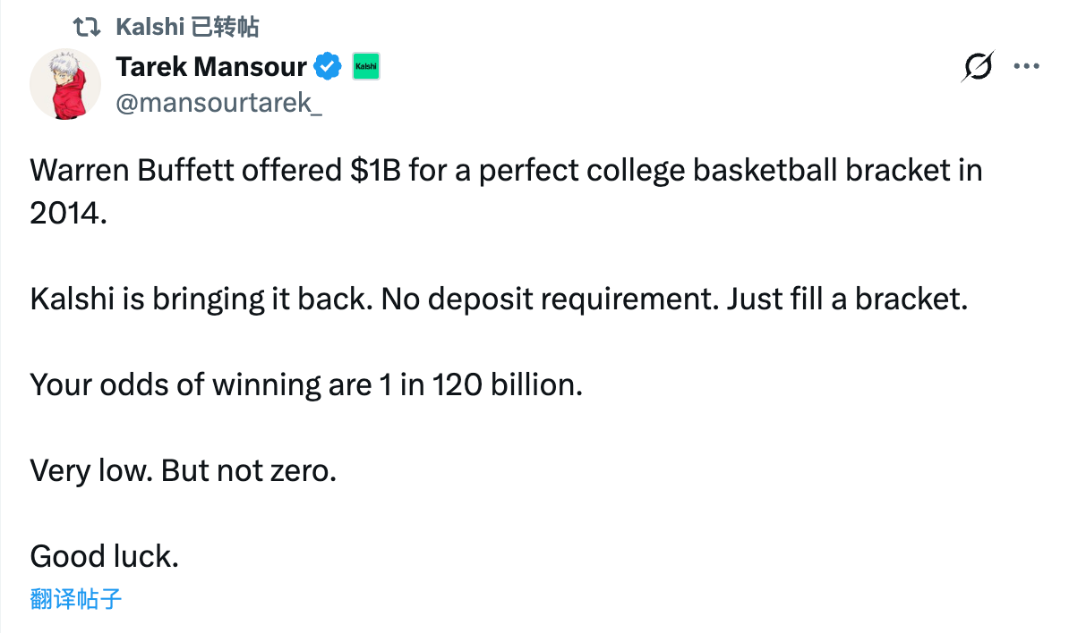 In the early morning of March 17, the prediction market Kalshi announced on X that it would follow in the footsteps of stock god Buffett and launch the "Perfect Bracket Challenge" for the upcoming NCAA "March Madness" tournament — users who perfectly predict all match results will receive a super grand prize of 1 billion dollars.