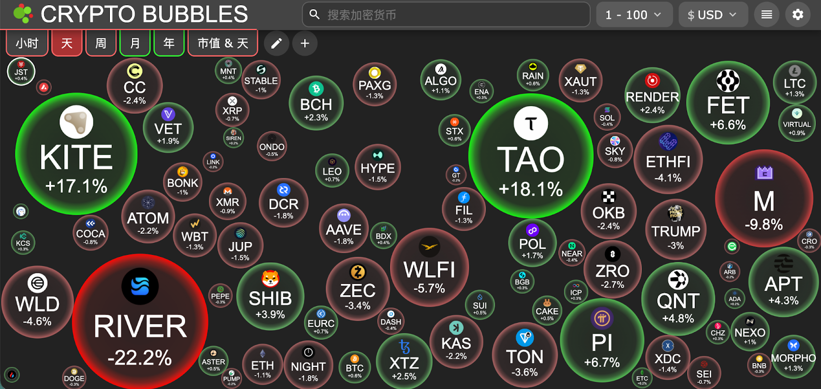 今日市值前100币种最大涨幅:Bittensor涨18.1%、Kite涨17.1%、Pi Network涨6.7%、ASI Alliance涨6.6%、Quant涨4.8%。