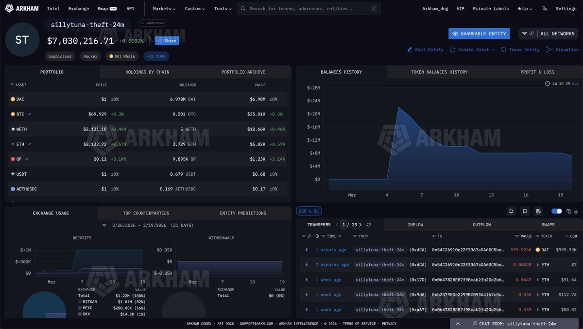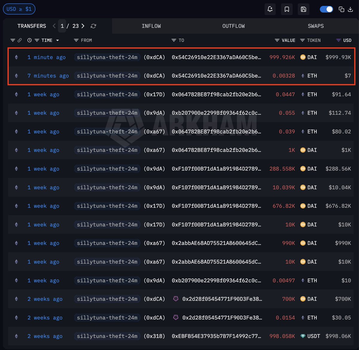 大约两周前,Sillytuna在现实世界中遭到小偷的袭击,损失了2360万美元的加密货币。您可以在Arkham上追踪他们: