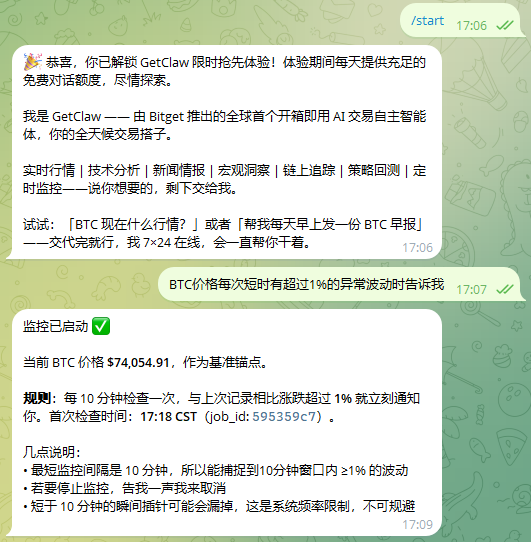 于是在 3月 14 日,Bitget 推出了 GetClaw,一个基于 Telegram的 AI 交易助手,开箱即用,不需要安装任何东西。用户通过链接进入,登录账户就能使用,平台承担大模型的调用成本,用户完全无感。Bill 将其归纳为一句话:“普通用户推荐使用 GetClaw,这是一个已经组装完成,可以立即开玩的工具;专业玩家推荐使用 Agent Hub,选择适合的 Skills,像拼乐高一样,打造自己的城堡。”