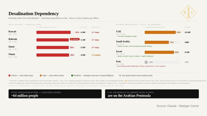 If the U.S. and Israel continue to strike vital support infrastructure, Iran will respond in kind, and as air defense interception resources become increasingly scarce, striking these facilities will become easier. This represents an asymmetric and deadly vulnerability for Gulf countries and Israel. Approximately 64 million people in the region may be affected. This will trigger a humanitarian and refugee crisis, making the Syrian civil war look trivial in comparison, with consequences spilling over into Europe and Turkey.