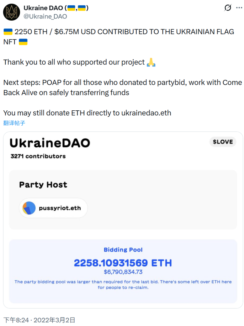 他们的方式是拍卖一幅描绘乌克兰国旗的 NFT 作品。去中心化自治组织「Ukraine DAO」结束的一场拍卖中筹集到了 2258 枚以太币,当时价值约合 679 万美元。