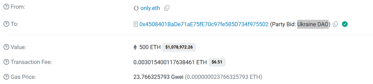 区块链追踪平台 Etherscan 显示,2 月 27 日,名称为 only.eth 的地址向乌克兰 Ukraine DAO 捐赠了 500 枚 ETH,如今价值 107.9 万美元。