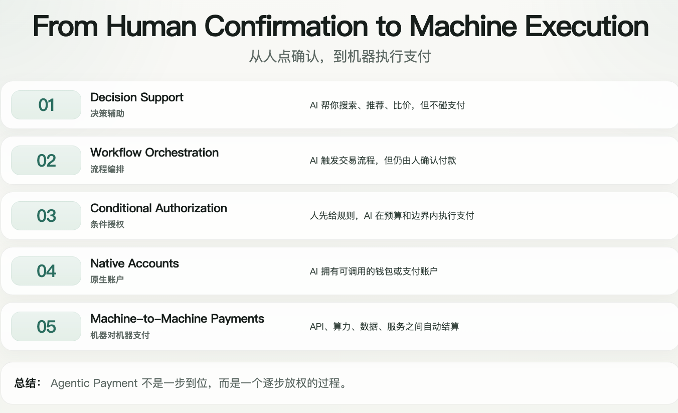 换句话说,这件事真正的问题不是「AI 什么时候开始付款」,而是:人类会在什么条件下,逐步把支付权交给机器。如果把这条路拆开来看,大致会经历五个阶段。