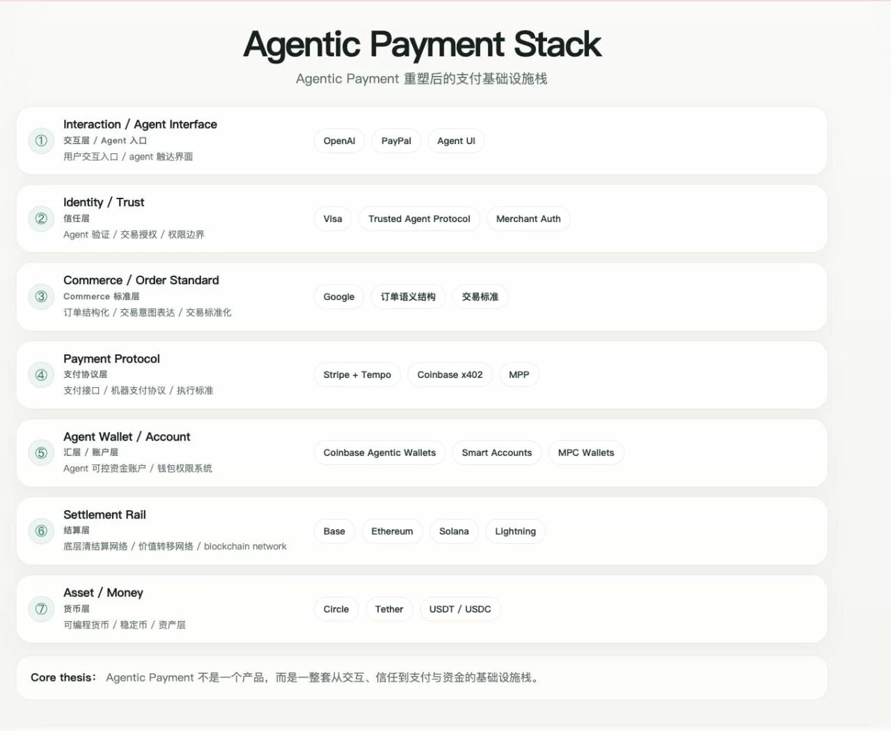 Agentic Payment 不是一个产品,而是一整套正在同时长出来的基础设施栈。从协议、身份、标准,到钱包、结算和货币层,Agentic Payment 的关键拼图,其实已经同时在不同玩家手里开始成形。