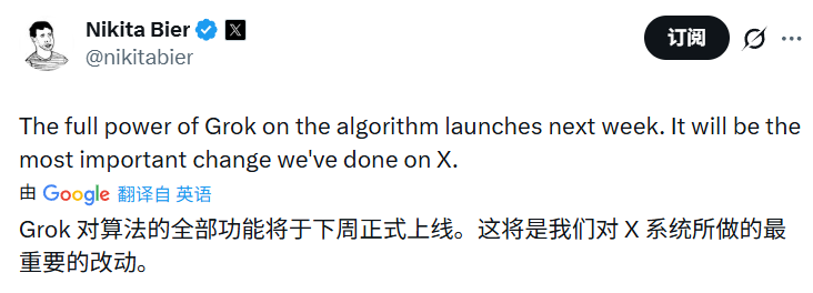 According to X product leader Nikita Bier, starting next week, Grok's capabilities will be fully integrated into the recommendation system, and he directly defines this update as the most significant change X has made to date.