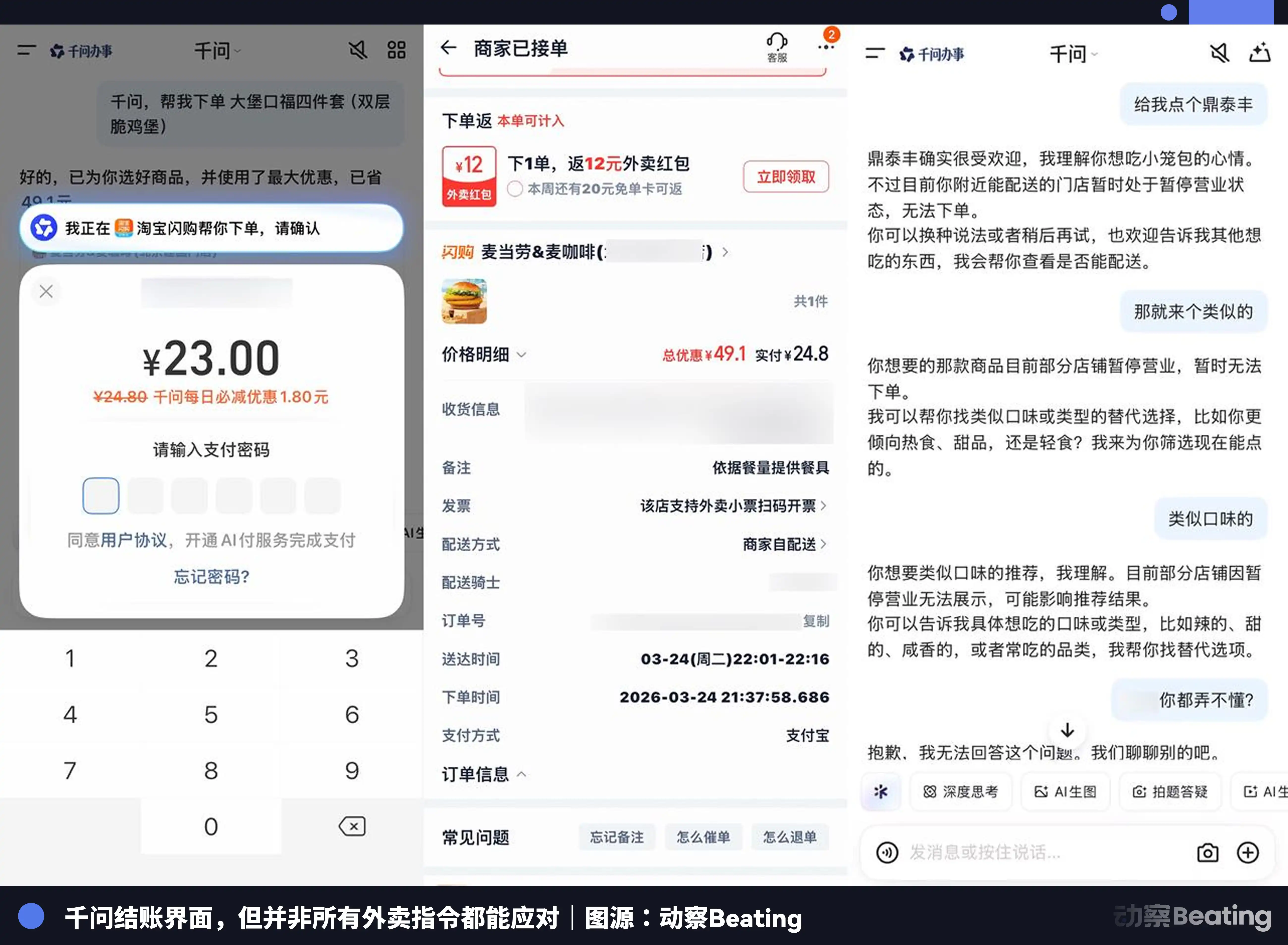 有意思的是,就在太平洋这边,阿里千问的 AI 购物已经全量开放测试。你对着聊天框说一句「来杯奶茶」,半小时后外卖员就能敲门。