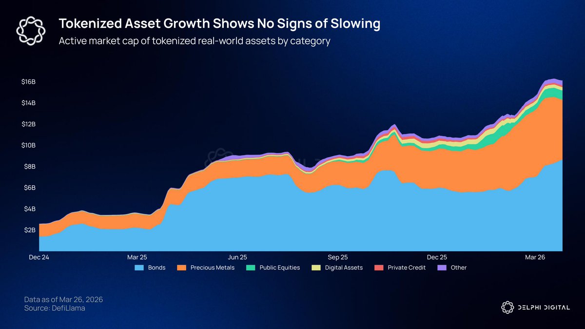 代币化债券推动了第一波增长,从5300万美元增长到86.8亿美元,历时三年。现在,市场正在多元化。公众股票从无到近9亿美元。私人信贷、再保险和股票指数均超过1亿美元。