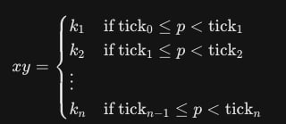 从数学上看,这种机制可以被视为一个分段函数,其中池子的流动性k会随着当前价格p穿过预设的价格点而发生跳跃 :
