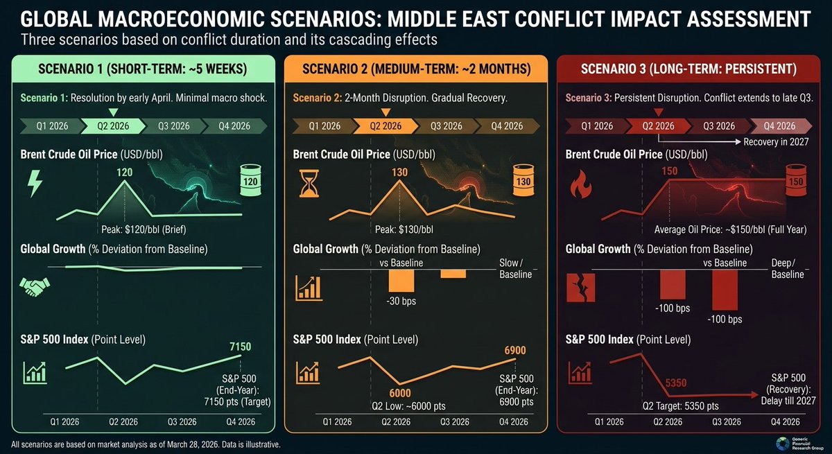 剧本 3(持续到三季度末的持久战): 全年油价维持在 150 美元附近。全球经济增长砍掉近 100 个基点。标普 500 二季度直接砸向 5350 点,市盈率从 22 倍杀到 18 倍,且直到 2027 年才能真正复苏。