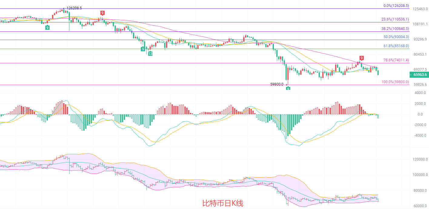 把日K线拆开看,比特币的下跌早就有迹可循:从75998跌下来后,所有短期均线都开始往下走,把价格压得死死的;MACD指标也从红转绿,而且绿柱子越来越长,说明南下力量还在不断变强。现在价格已经跌破66000,7万变成了强压,下方第一道防线在65000带66000,若失守会继续南下冲击年内最低点