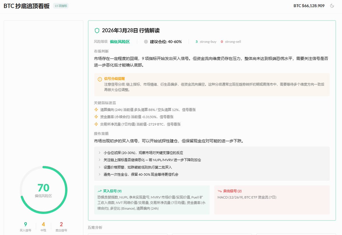 市场存在一定程度的回调,9 项指标开始发出买入信号。但资金流向维度仍存在压力,整体尚未达到极端恐慌水平,建议开始试探性建仓。
