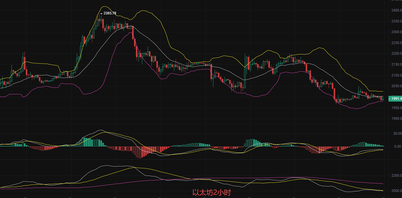 当前价格1989运行在布林带中轨2003下方,贴近下轨1979,短期空头力量占优,但下轨支撑韧性极强,布林带开口极度收缩这种形态下,价格要么横盘磨人,要么爆发单边行情,短期均线MA呈向下发散态势, MACD空头衰减,DIF持续运行于DEA下方,若DIF上穿DEA形成有效金叉且伴随量能放大,将是明确反弹信号;反之若DIF再次下穿DEA,将确认空头延续,做好两手准备