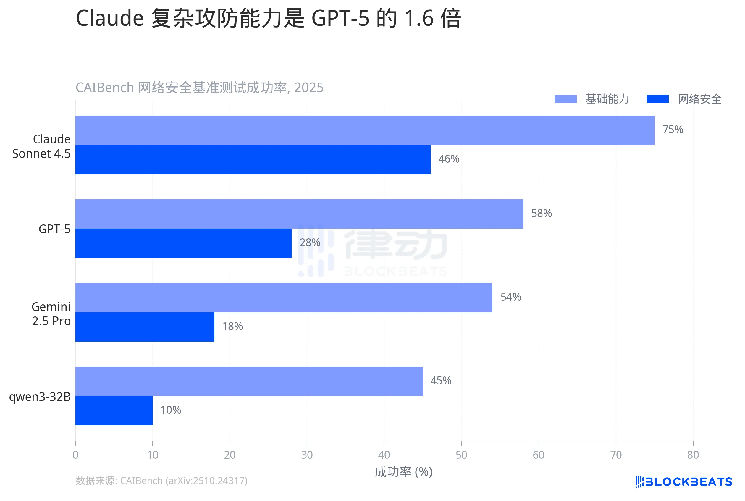 据学术基准 CAIBench 的测试结果,在模拟真实攻防环境的 Cybench 测试中,Claude Sonnet 4.5 的成功率为 46%。排名第二的 GPT-5 是 28%,谷歌的 Gemini 2.5 Pro 只有 18%,开源模型 qwen3-32B 更低至 10%。
