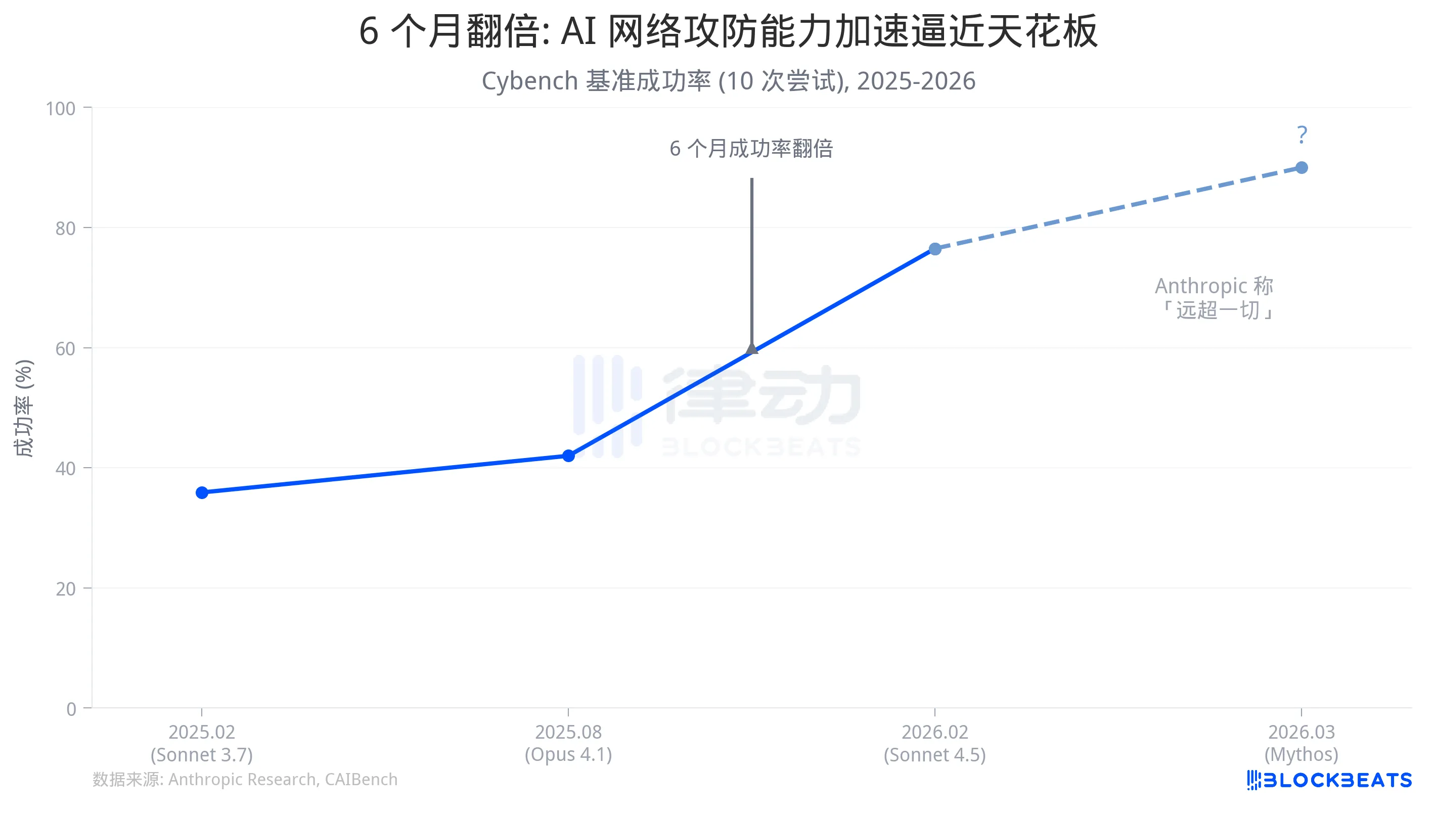 据 Anthropic 官方数据,2025 年 2 月发布的 Sonnet 3.7 在 Cybench 上的成功率是 35.9%(10 次尝试)。同年下半年发布的 Sonnet 4.5 达到 76.5%。Anthropic 研究团队的统计是:6 个月内,成功率翻倍。