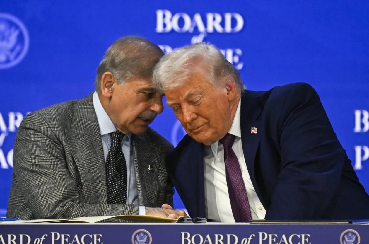 US President Donald Trump (right) and Pakistan's Prime Minister Shehbaz Sharif attend a peace committee meeting during the World Economic Forum in Davos on January 22. Photographer: Harun Ezzat / Anadolu Agency / Getty Images