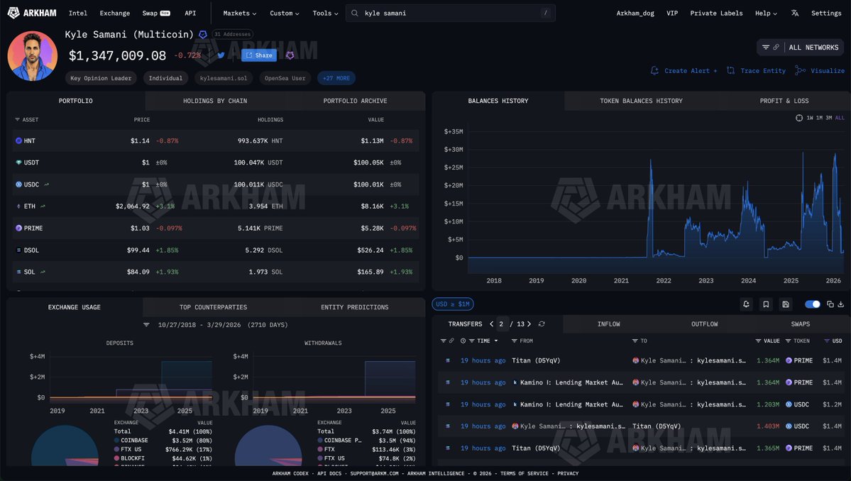 KYLE SAMANI JUST LEVERAGED $10M WITH DEFIKyle Samani has loop-deposited a total of $10M worth of PRIME into Kamino Finance