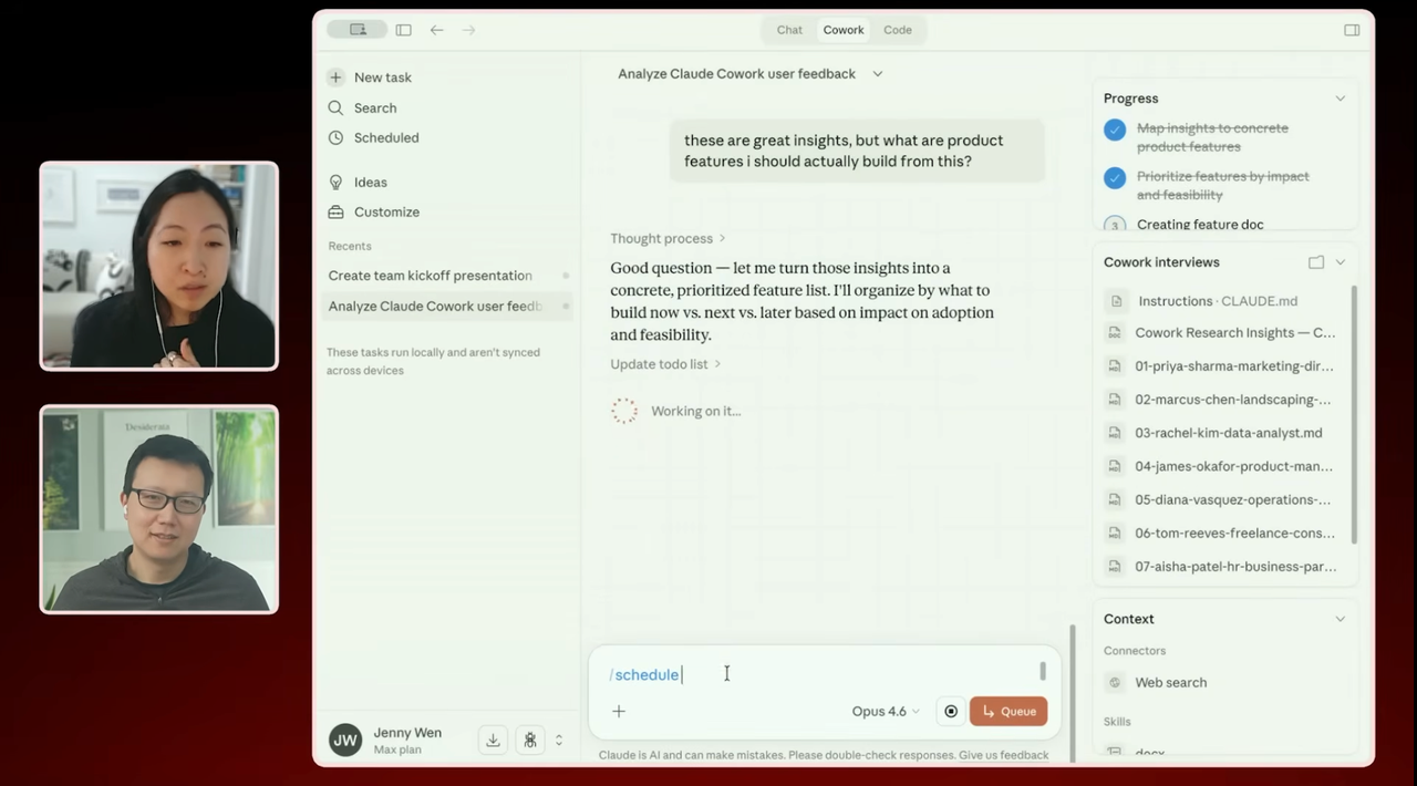 举个例子,现在我连接了一个文件夹,里面存放着一些用户访谈记录。我们 Cowork 团队非常注重与用户的紧密联系,这也是我们取得一定成功的关键之一。我们通过传统的用户体验研究 (UXR),直接与用户对话,同时也通过内部自用的方式,比如我们有一个专门用来收集反馈的 Slack 频道。此外,我们还会关注社交媒体上的讨论,并倾听那些热情用户的意见。正是因为我们始终保持与用户的紧密联系,并且能够快速迭代产品,我们才能不断改进并取得今天的成果。