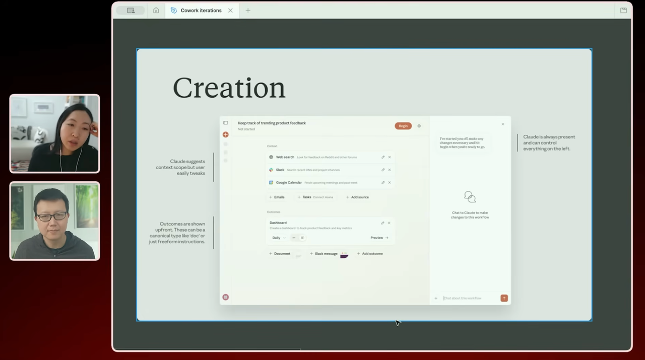 其实我们现在就可以通过 Cowork 直接做出来,我觉得我们的研究人员有一个会发出来的,我们还有一个会在 Slack 里 ping 我们的版本。我们也会直接听内部 Slack 频道,我们非常依赖内部和最强大的用户来给我们提供那种前沿反馈,因为内部人员真的愿意对你诚实,他们往往会把功能推到最远,而且也最容易跟进。