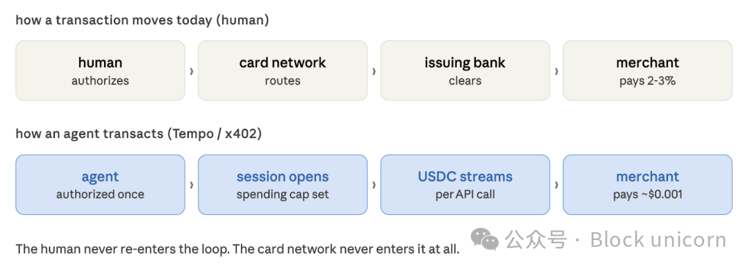 完成研究任务的代理每次会话都会调用数百次专门的数据 API。每次调用成本仅为几分之一美分。一周下来,这些调用可能为运营该服务的开发者带来 40 美元的收入。信用卡网络无法应对这种情况。最低交易额的经济模式行不通。商户入驻流程行不通。费用结构行不通。这类商业模式注定无法在 Visa 的框架下运行。它需要一种全新的模式,而 x402、Nanopayments 和 Tempo 正在构建这种模式。