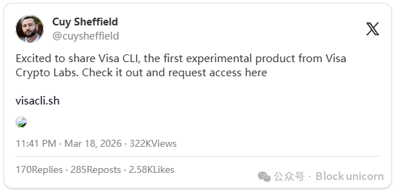 在 Tempo 上线的同一天,Visa 的加密货币部门推出了一款命令行界面工具,供人工智能代理通过终端进行支付,无需 API 密钥、无需账户,也无需人工授权。Visa 将其称为“命令行商务”——机器无需人工干预即可进行交易。