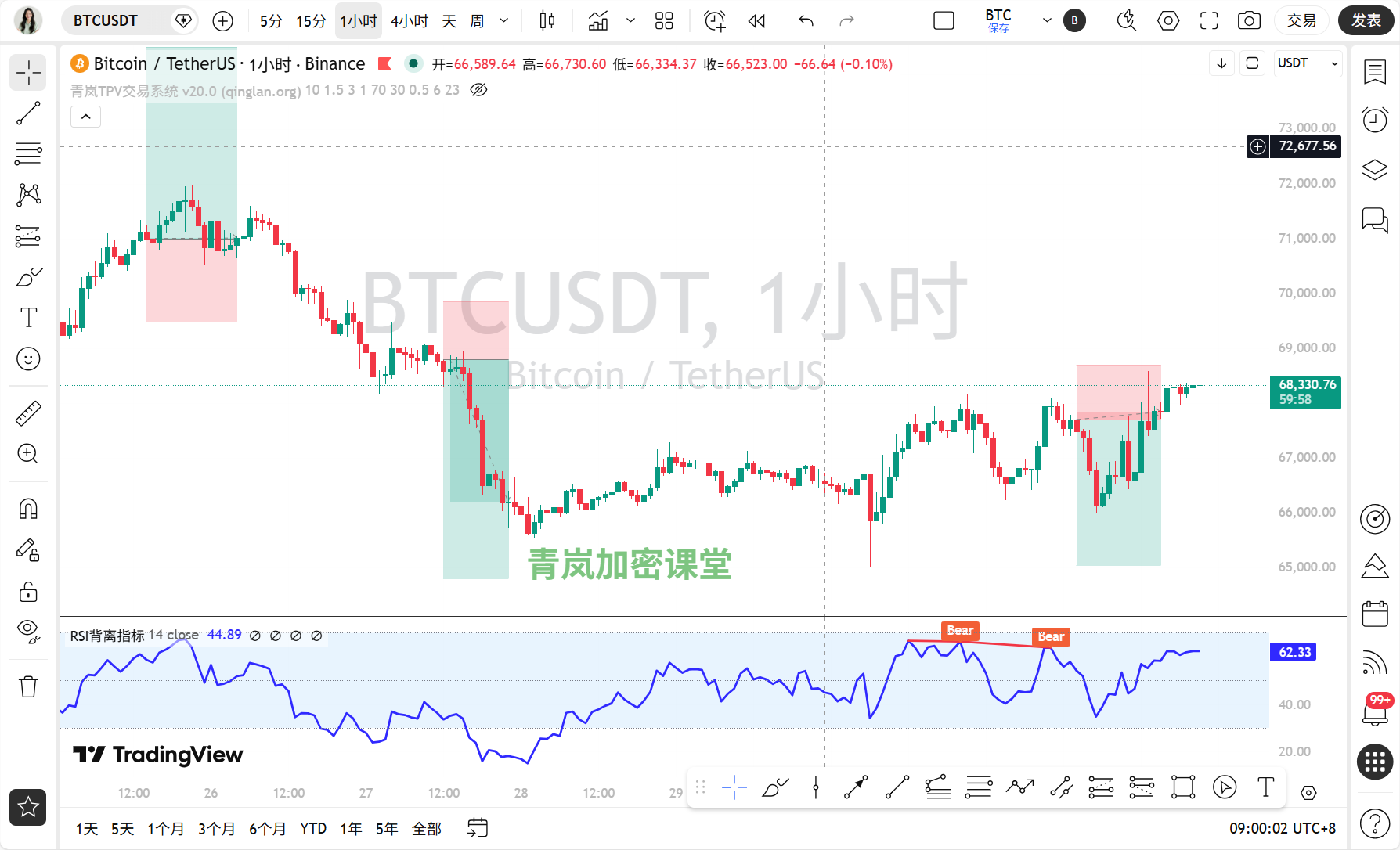 背离情况:目前1小时RSI超买而价格创新高(68378.64),存在顶背离的潜在风险,需要小心。