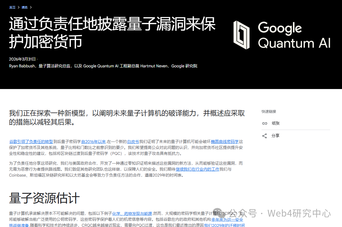 更重要的是,谷歌在这篇博文中给出了一个前所未有的硬性时间表:2029年之前,必须完成抗量子密码(PQC)迁移。这不是建议,不是预测,而是工程意义上的截止日期。谷歌同时宣布,已与Coinbase、斯坦福区块链研究中心、以太坊基金会等机构合作,共同推进这场可能是加密世界诞生以来最深刻的底层安全变革。