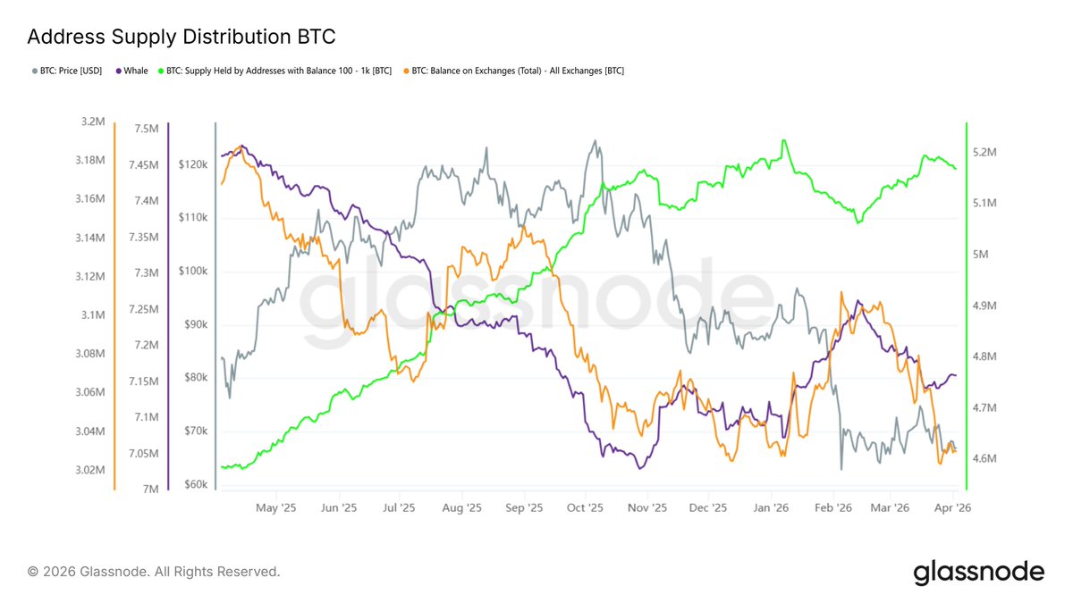 我重新加入了一组对比数据,能更明显一些,紫色的线是持仓大于 1,000 枚 Bitcoin 的所有地址,确实能看到最近一年中,一直到2024年10月份,也就是 $BTC 的价格还在超过 11 万美元的时候持仓量是一直下降的,但从去年 11 月一直到现在,这个持仓量是缓慢上升的。