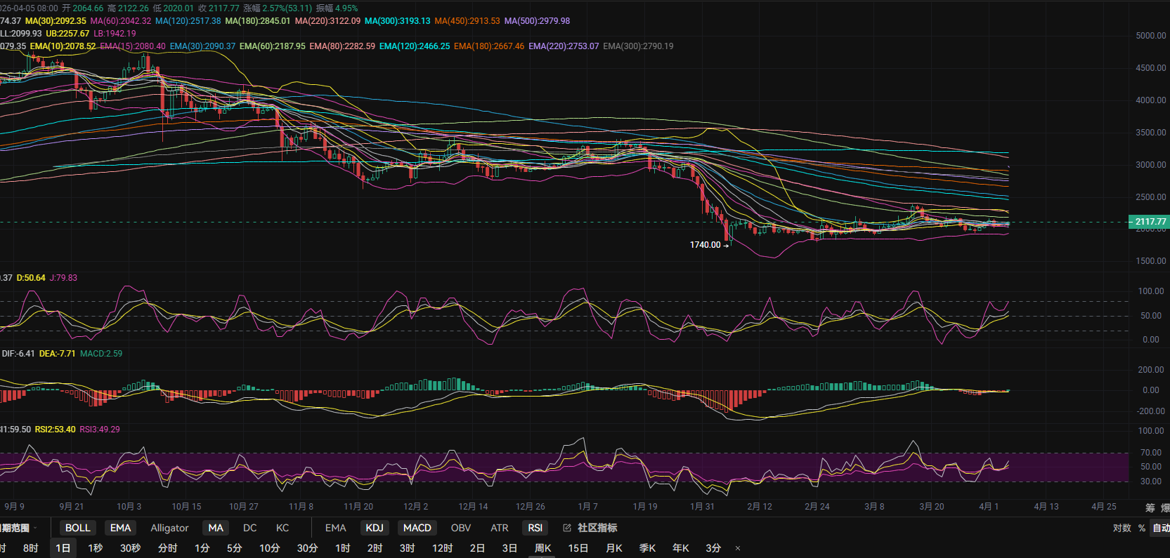 以太坊1日线图中布林带呈收口形态,k线近日在MA60线上形成强势支撑反弹,当前上方面临EMA60与上轨区间压力;MACD中0轴上方放量增加,快慢线收口成型有望形成金叉,KDJ三线抬头上扬接近80,RSI三线交叉向上接近60,目前还未形成严重超买,说明上方空间还未走完,做空需谨慎,建议回调做多为主!若8小时图中MA220与4月2号高点平行压力位无法得到突破,那么短期币价可能继续面临回调阶段,从而可以选择高空介入!若价格突破此点位,表明上涨动能依然强劲,做空逻辑失效,需及时止损调整到日线上轨2250位置附近寻找做空机会!