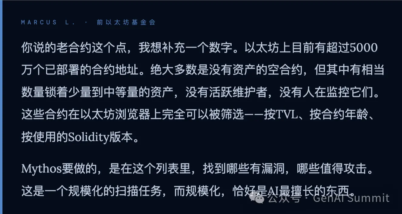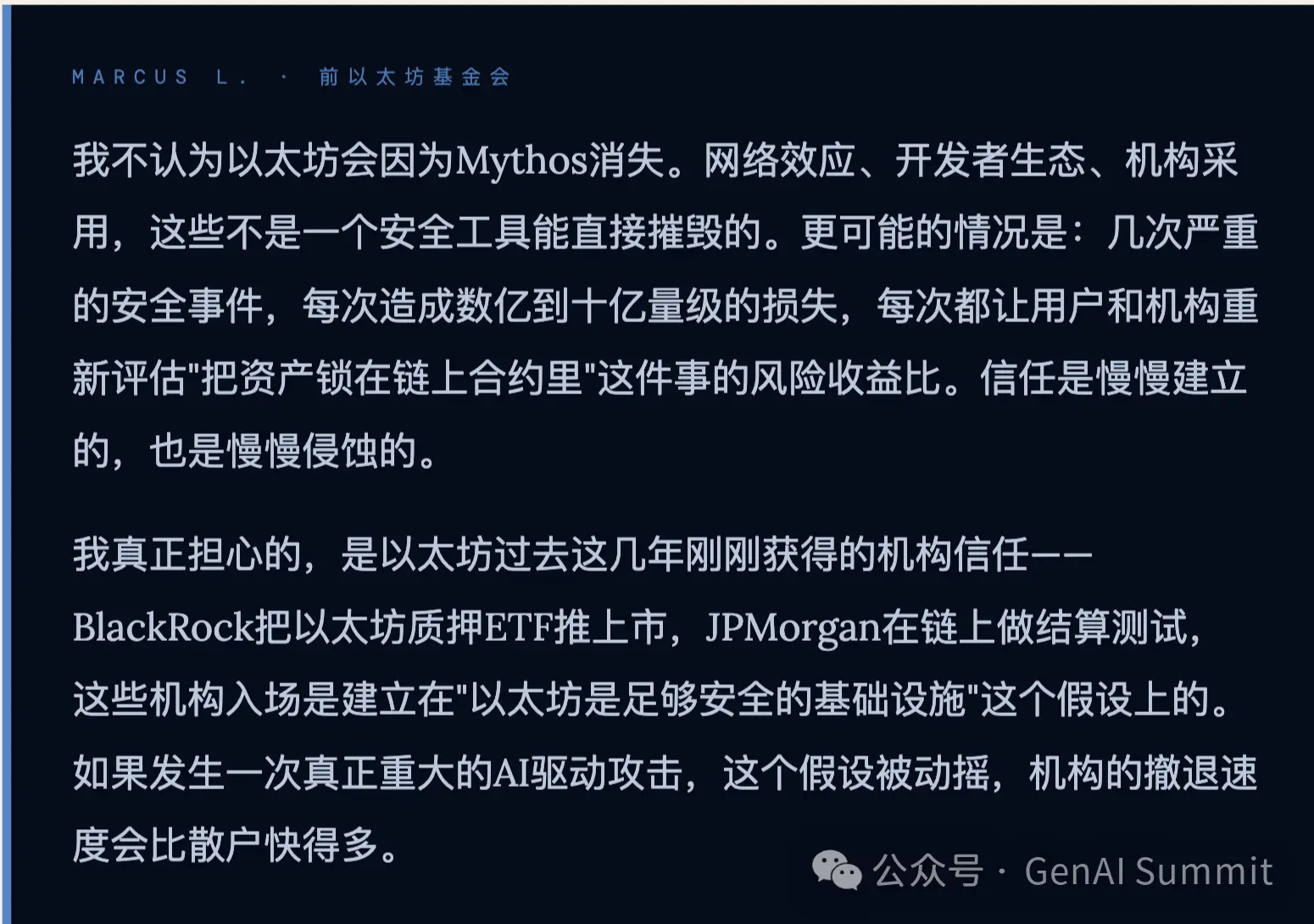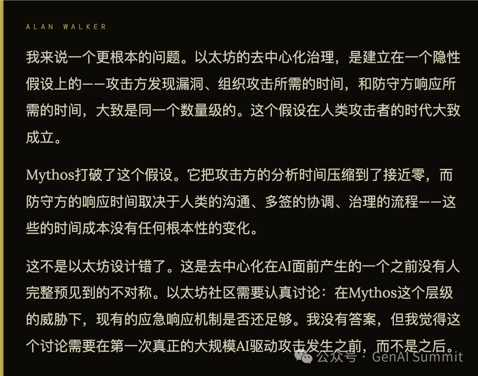 I stood some distance away and took down everything I could hear. This was the most honest conversation about Ethereum's security risks I had ever witnessed. Not because they used any vocabulary I had not heard before, but because they clearly articulated one thing by putting together what had already happened and the trends that were happening: the security boundary we thought existed may no longer be there in the face of Mythos.