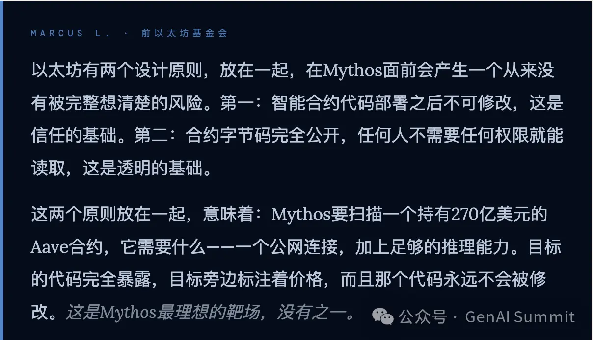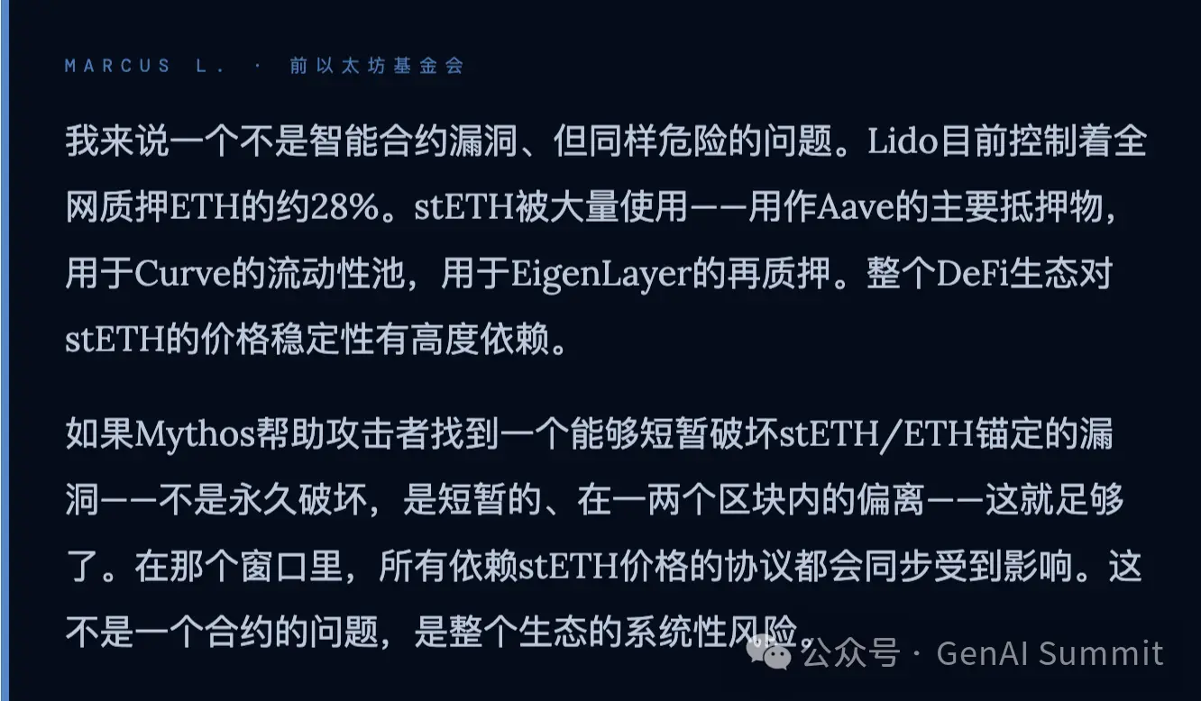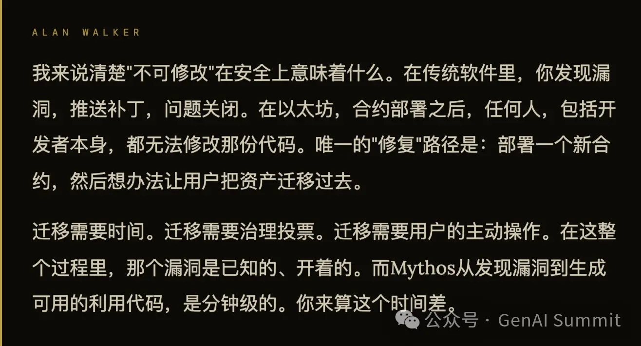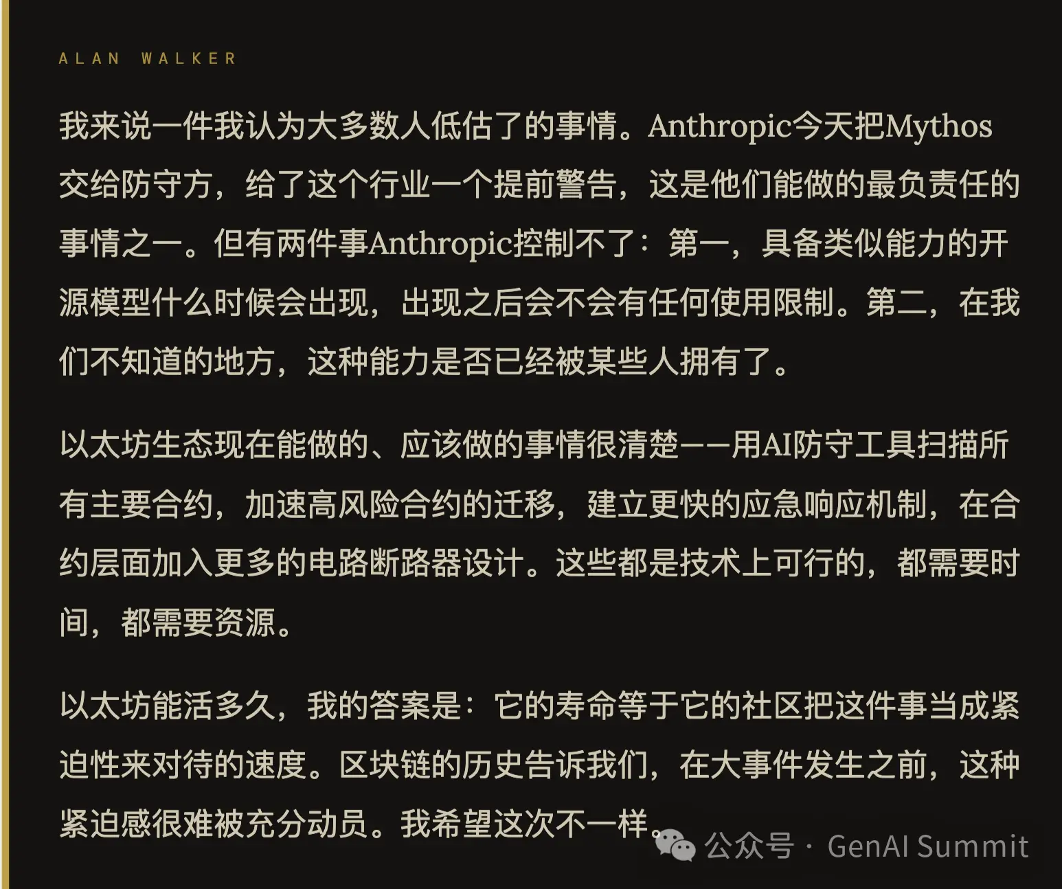 I stood some distance away and took down everything I could hear. This was the most honest conversation about Ethereum's security risks I had ever witnessed. Not because they used any vocabulary I had not heard before, but because they clearly articulated one thing by putting together what had already happened and the trends that were happening: the security boundary we thought existed may no longer be there in the face of Mythos.