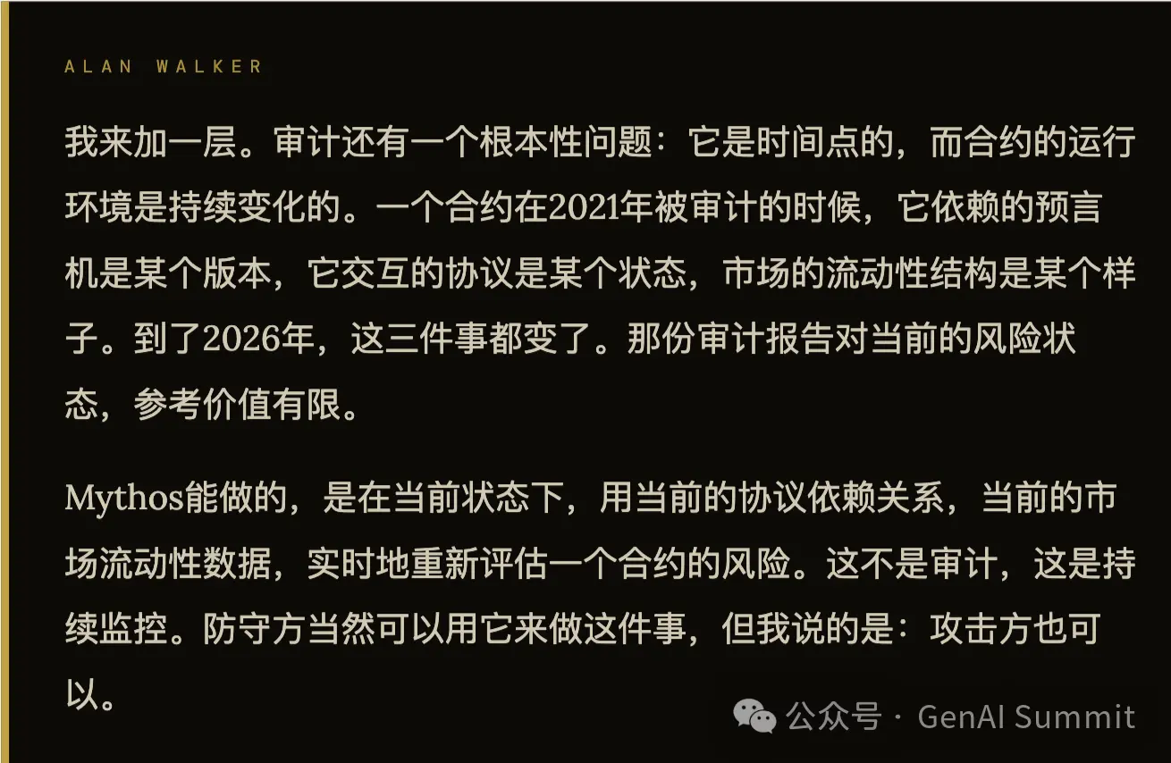 "Audits are photos taken in 2021. The operating environment for contracts in 2026 is different from the scene in that photo. Mythos is looking at today's reality, not that photo."