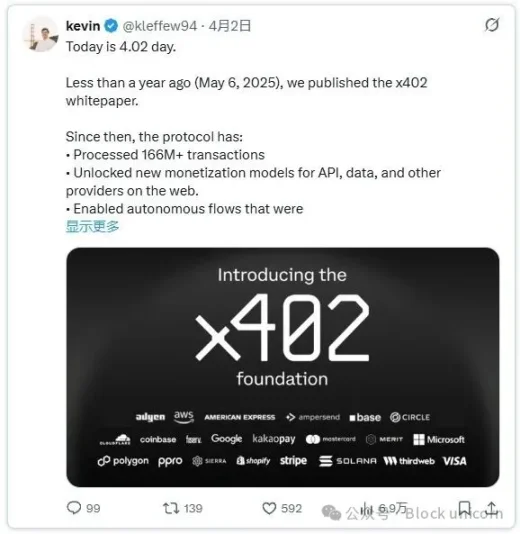 谷歌、AWS、微软、Visa、万事达卡、美国运通、Stripe、Cloudflare、Shopify、Circle、Solana 基金会、Polygon Labs 等众多公司都在支持 x402。
