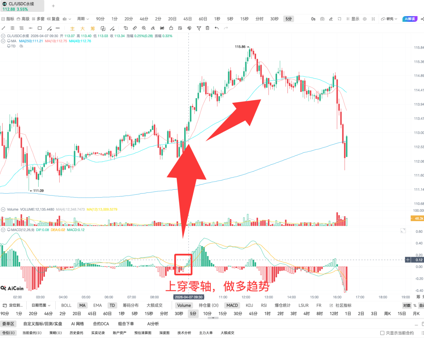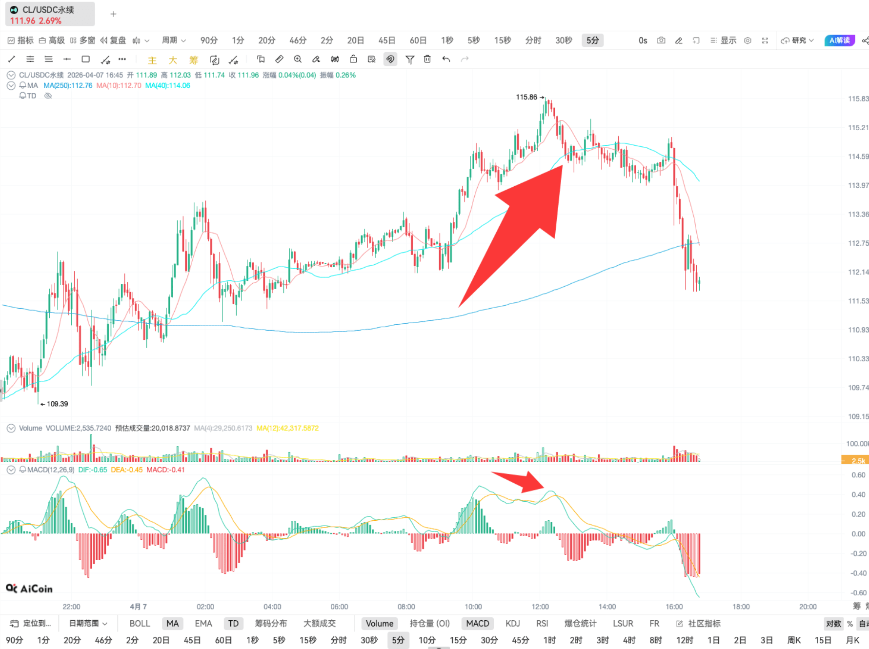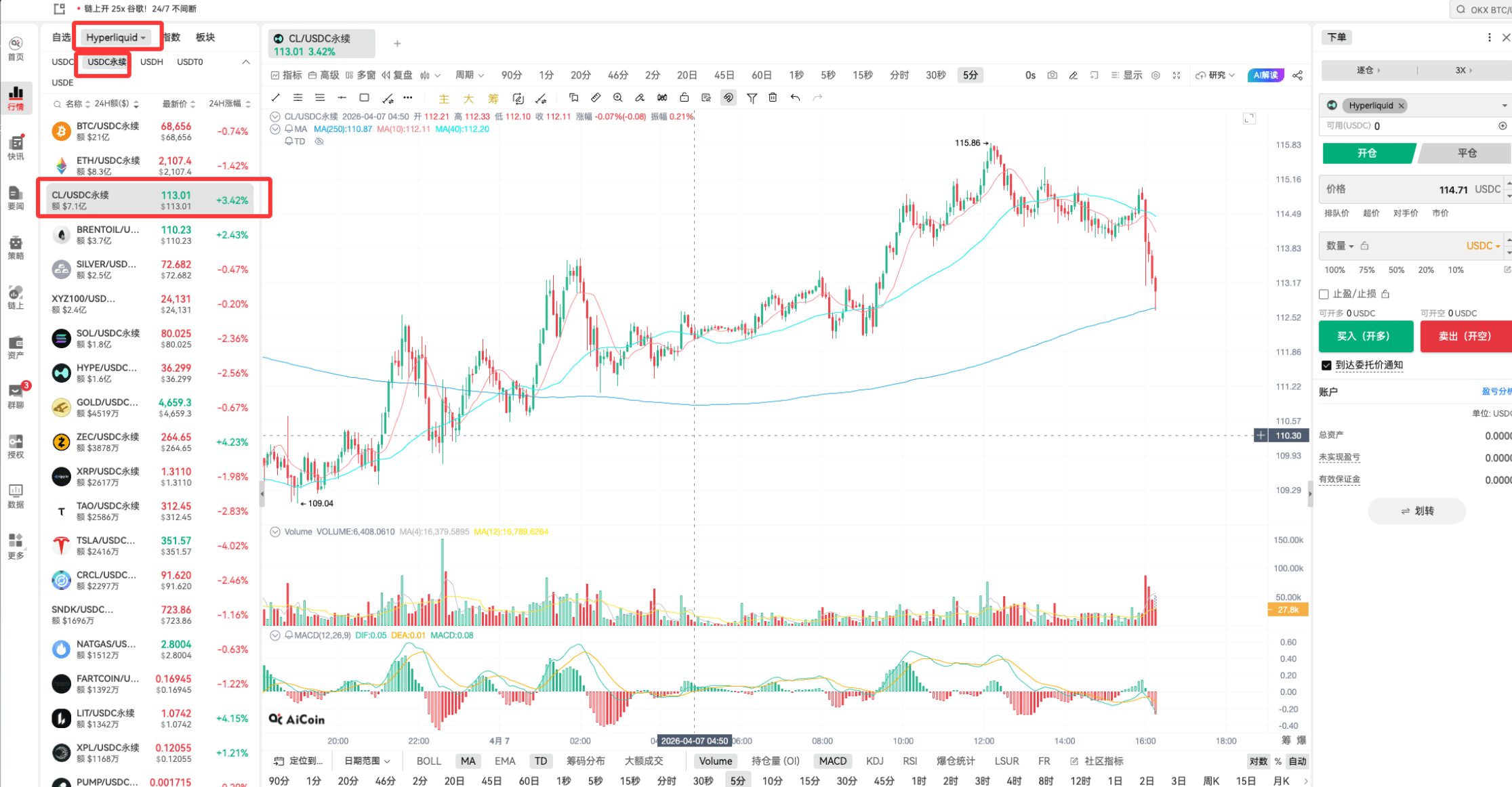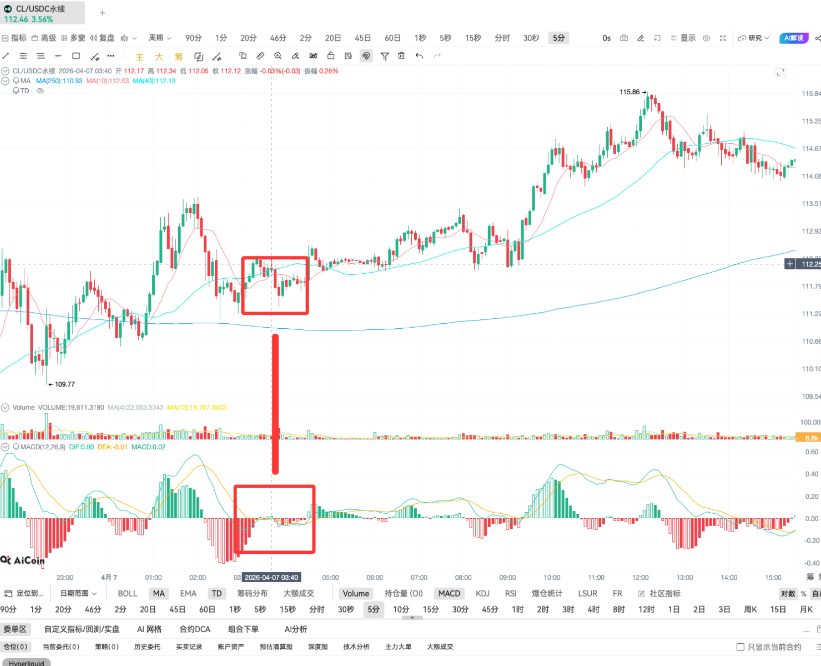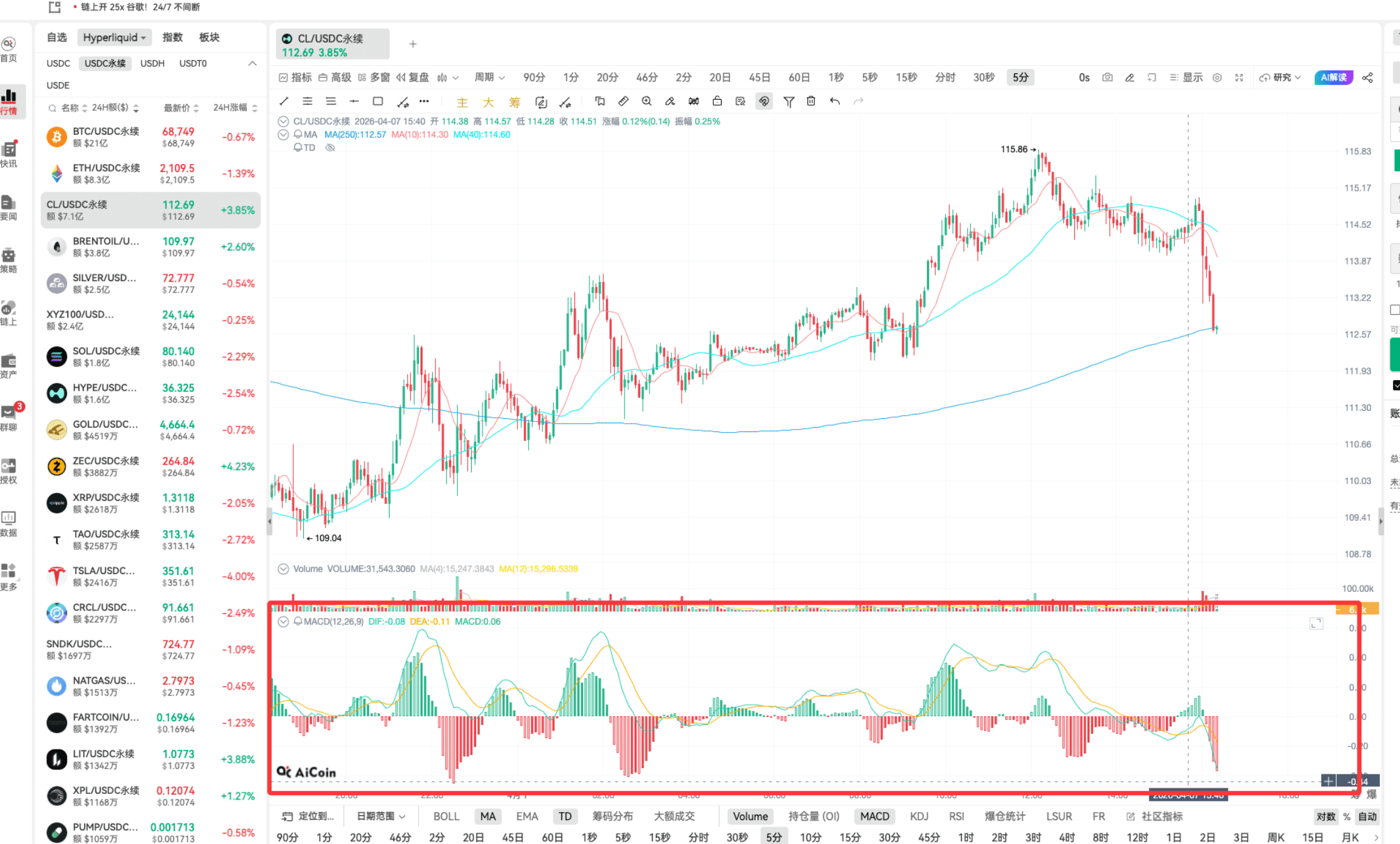 Let's start with the basics of MACD. You can directly open the oil K-line chart on Hyperliquid, and we will analyze it in real-time, learning as we go.