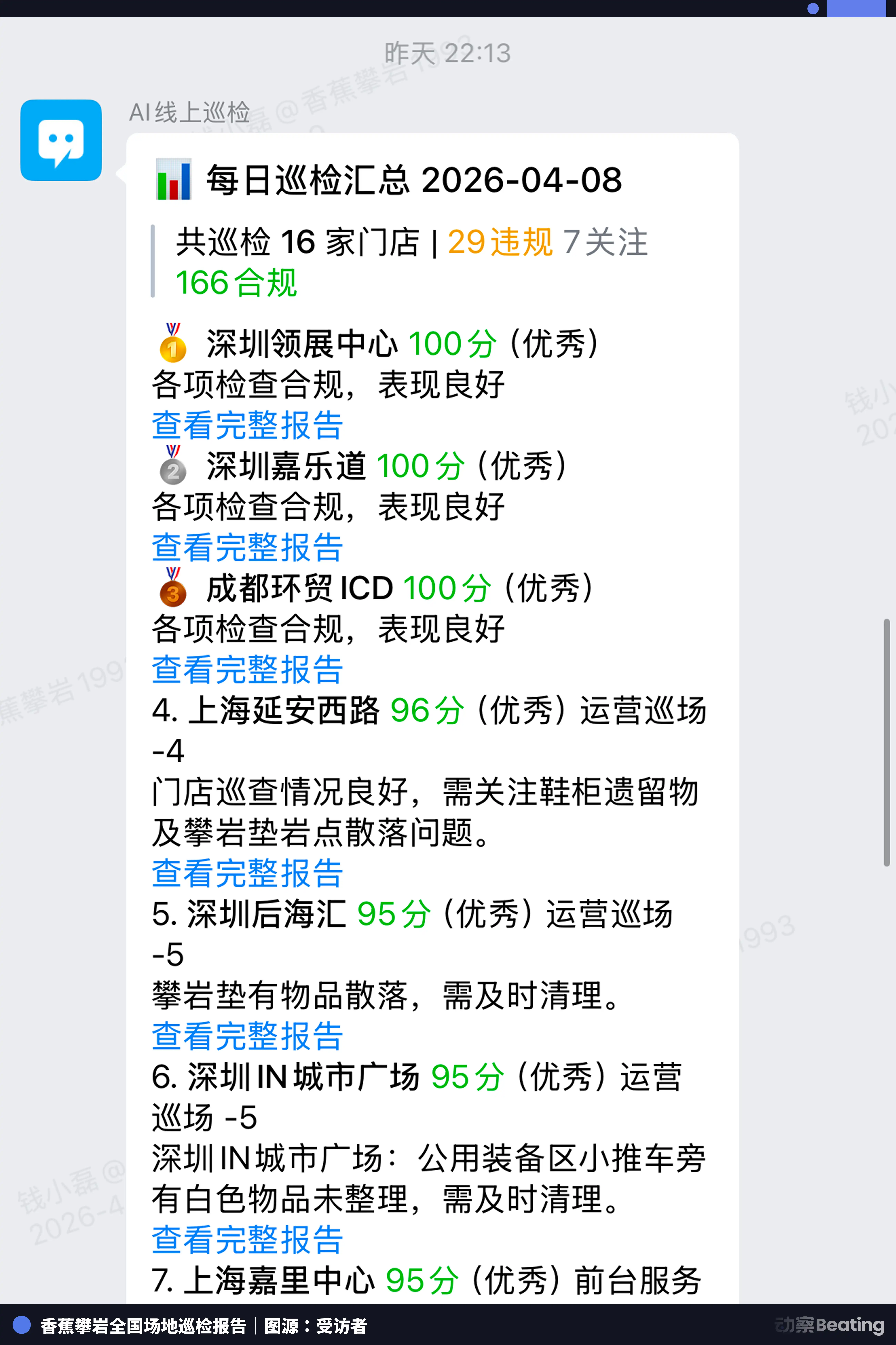 This system addresses the conflict between store scale and distance. Banana Climbing's stores are dispersed in seven cities, averaging three stores per city, and traditional supervisory travel inspections incur staggering costs. This AI system's daily operational cost, including API and token fees, is only just over a hundred yuan.