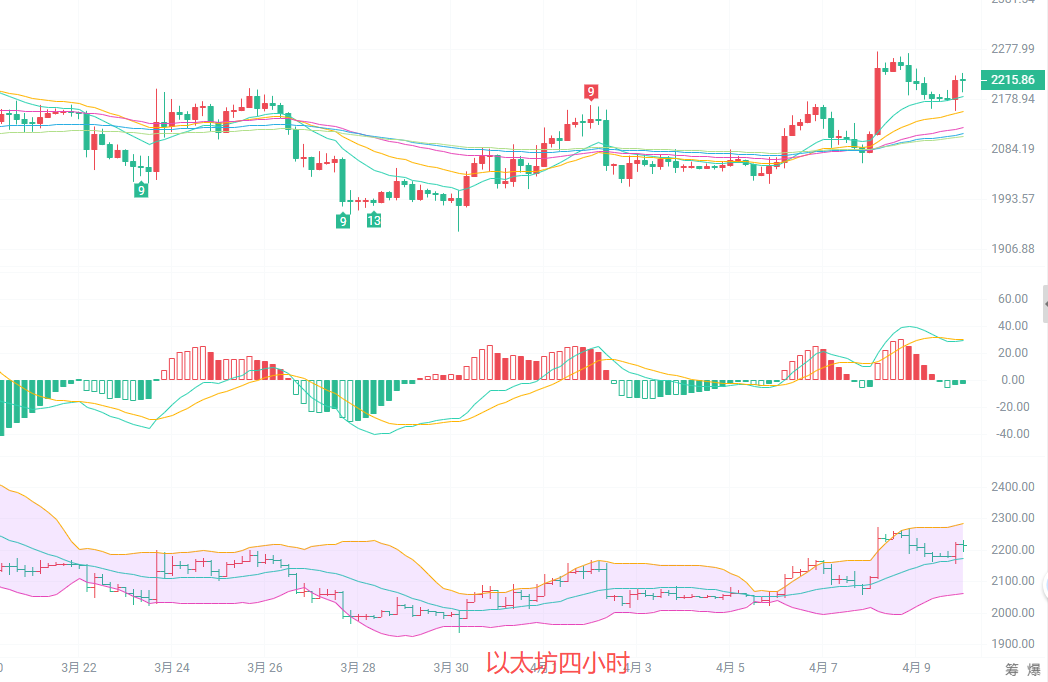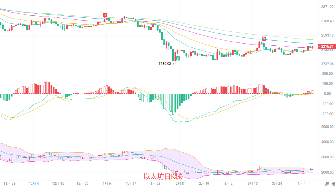币圈丽盈:4.10以太坊现价2220,布林带开口上行,短期趋势维持多头结构!最新行情分析操作建议