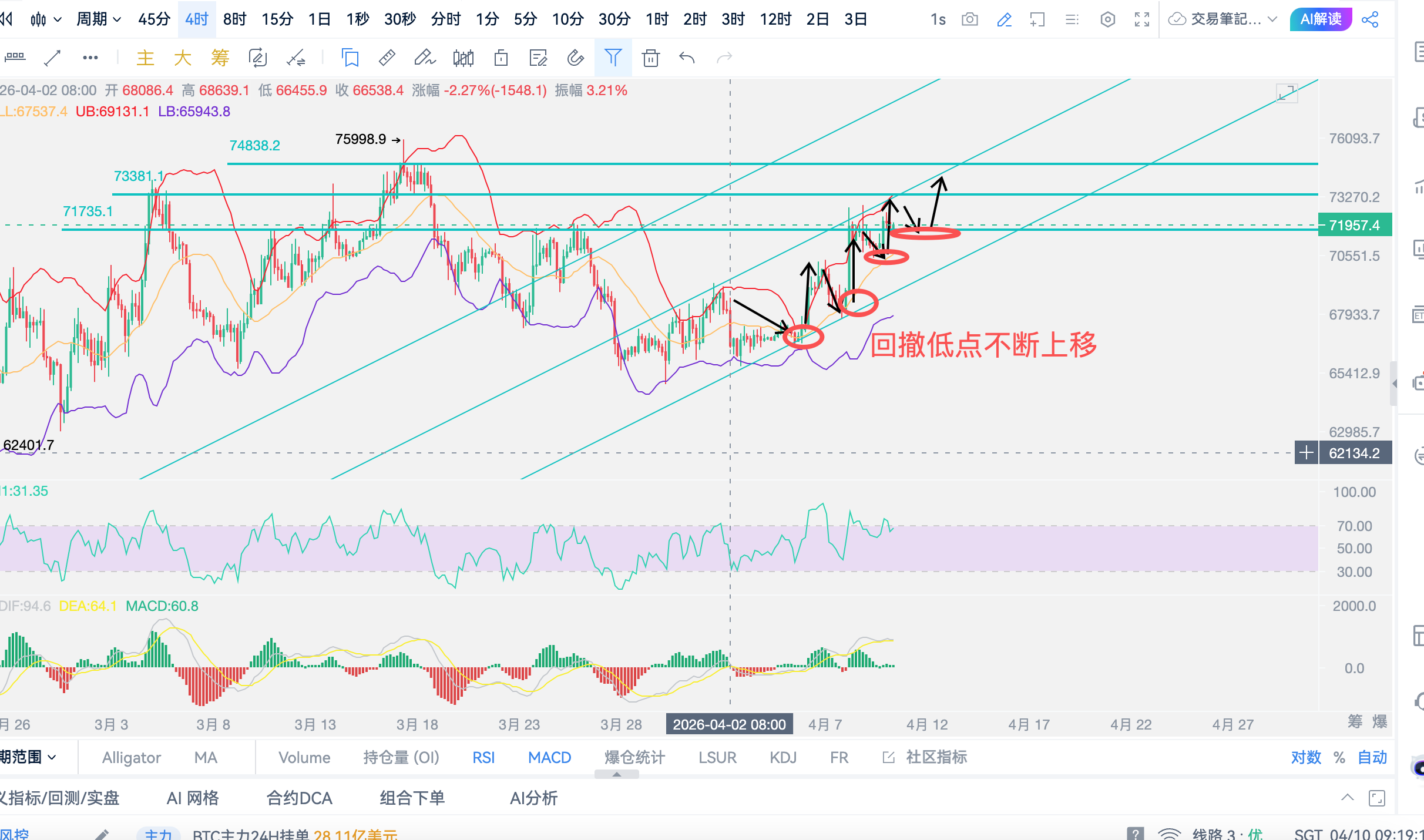 币圈院士:4.10比特币日线金叉红柱拉满,72000 反弹趋势彻底确立!最新行情分析