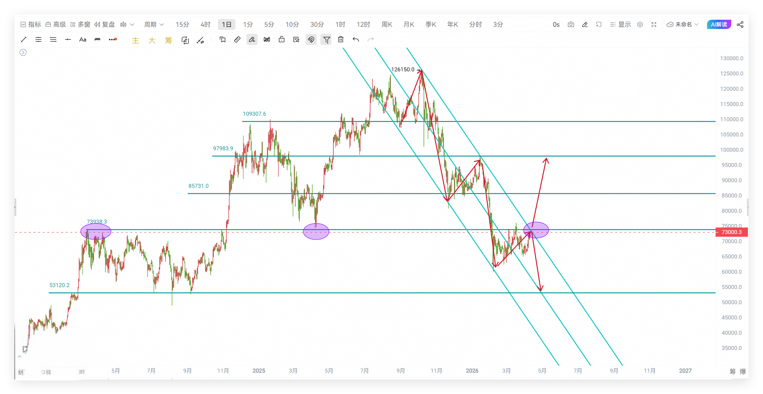 这种弱势震荡,本质更像下跌中继,并非真正筑底。下周大概率不会走强势单边上涨,反而震荡走弱的概率更大,一旦7.3万这个位置最终被确认跌破,就会打开新的下跌空间,行情很可能走出单边下跌,向下寻找6.0万-6.3万区间支撑。