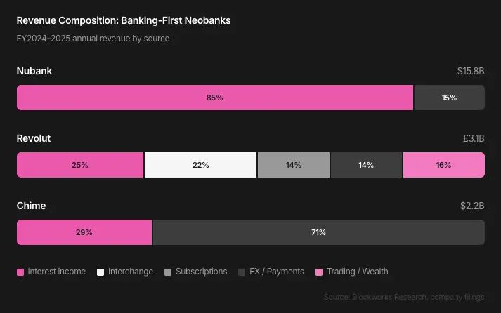 Nubank 在 2025 财年公布了 158 亿美元的收入,其中 85% 来自利息收入。信用卡利息贡献了 46 亿美元,贷款利息贡献了 48 亿美元。每位活跃用户的月收入达到 15 美元,而服务成本仅为 0.80 美元,这是 19 倍的回报。SoFi 在 2022 年获得了银行牌照,季度净利息收入在四年内从 9490 万美元增长到 6.17 亿美元,存款成本比仓储融资成本低 181 个基点,年化节省约 6.8 亿美元。Revolut 在 2024 年跨五个业务流实现了 31 亿英镑的收入,没有任何单一业务线的占比超过 30%,交易/财富业务线同比增长 298%。