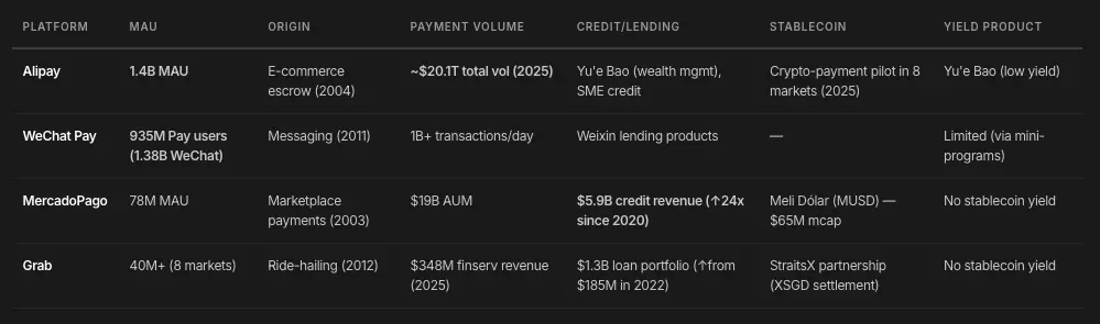 MercadoPago、Grab、微信、支付宝。它们最初并没有打算建立银行,而是将金融嵌入到了商业应用中。护城河不是产品本身,而是分发渠道和行为数据——这使得它们能够进行比任何银行都更精准的信用评估。