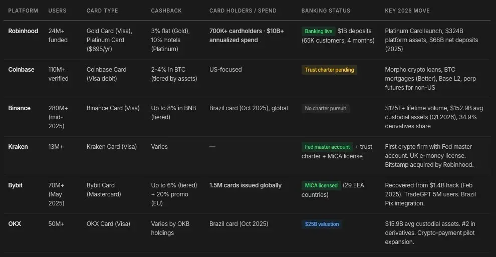 Robinhood、Coinbase、Binance、Kraken、Bybit、OKX——从加密货币中心化交易起步,并扩展到加密银行业务。这个群体中的每个平台都在明确地构建银行层,以产生不需要依赖牛市就能获得的收入。