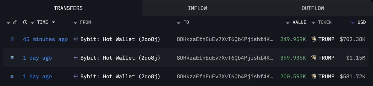 鲸鱼 8DHkza 在过去两天内从 #Bybit 提取了 850,488 个 $TRUMP(240 万美元)。