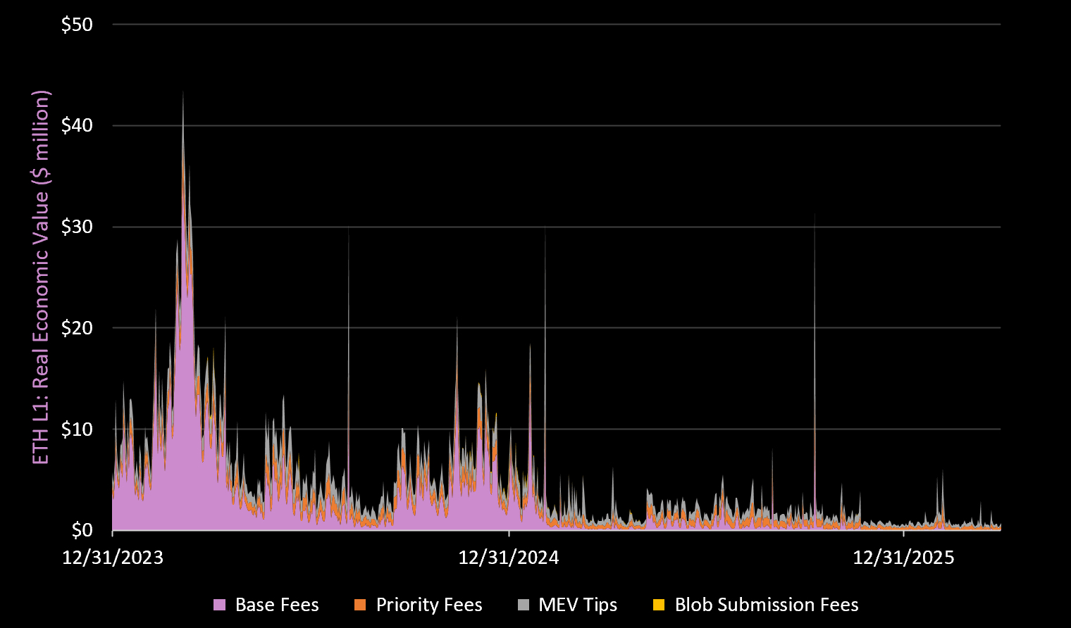 总体来看,第一季度实际经济价值环比下降 43%,同比下降 71%,反映出整个季度处于明显的「避险」市场环境。虽然 L2 层的用户体验与吞吐量持续改善,但尚未看到这些改善转化为 L1 层可观的费用收入。鉴于当前加密市场整体「避险」情绪浓厚,叠加 DeFi 收益低迷,预计这一趋势将在短期至中期内持续。