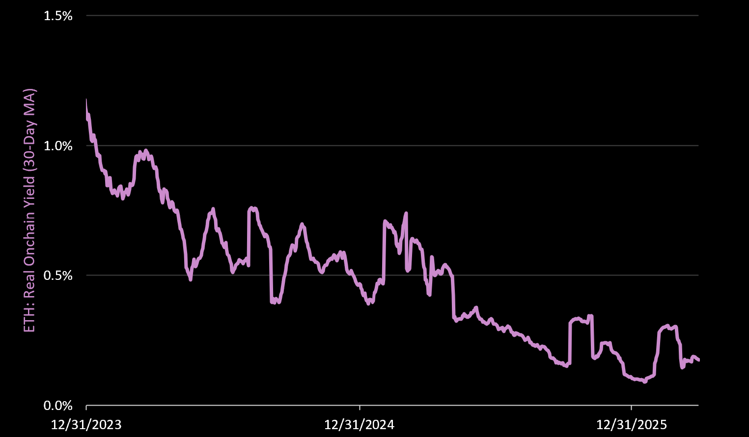 更多 ETH 被质押 = 若链上费用未同比增加,那么质押的 ETH 越多,质押收益率就越低。原因在于:质押量的增长会导致新增发行量的增幅相对缩小。如果链上费用收入和/或代币销毁无法弥补这一缺口,质押收益率就会下降,同时网络通胀率上升——正如我们在第一季度及此前多个季度所观察到的趋势。