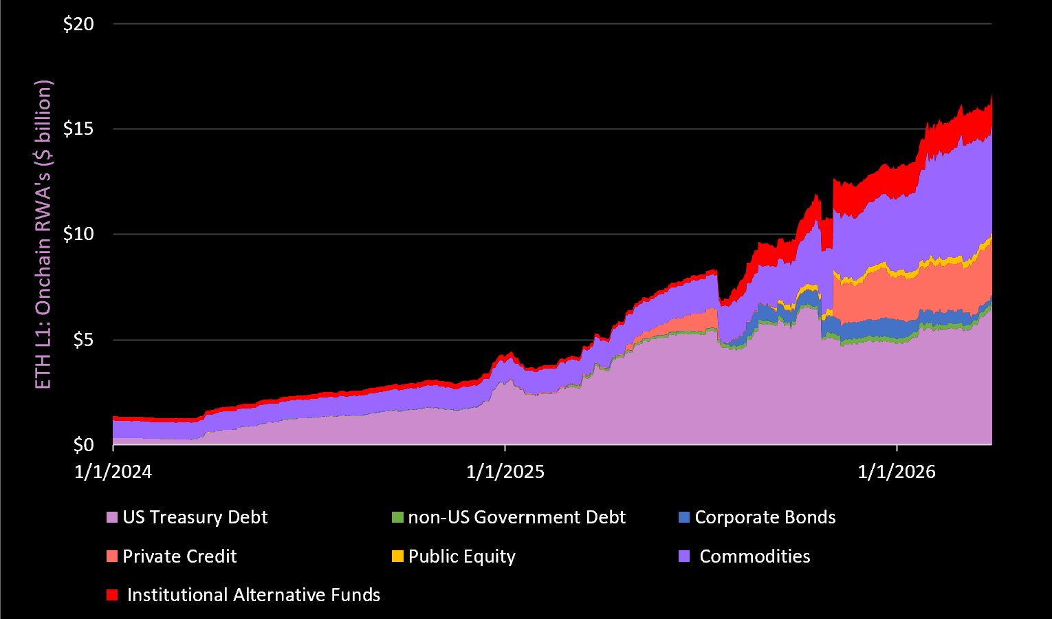 总体而言,以太坊 L1 上目前已有超过 160 亿美元的 RWA 总量,季度增长 27%,同比增长 225%。
