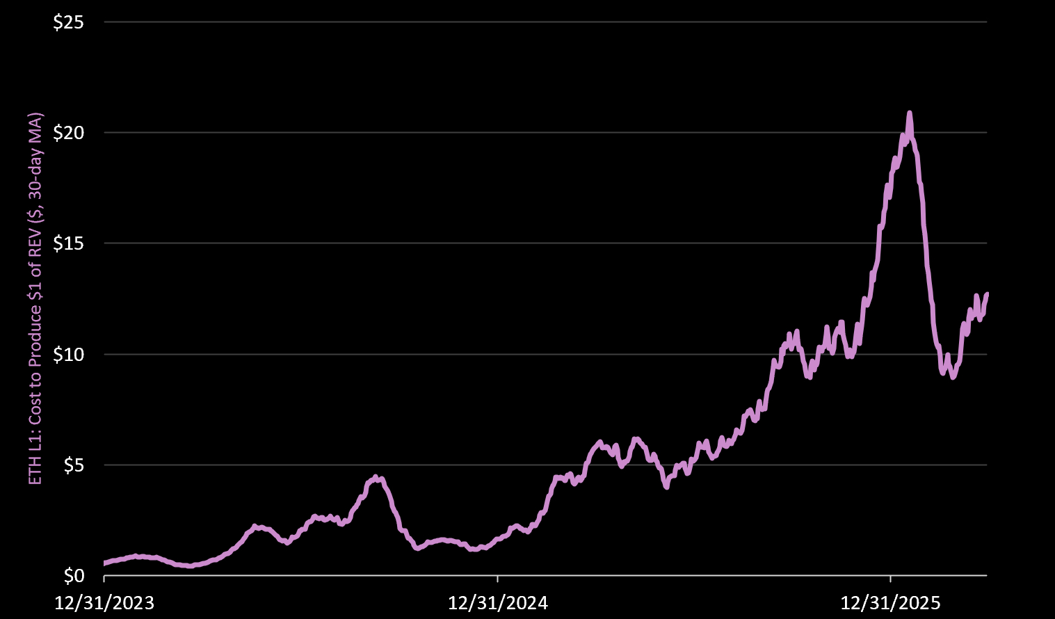 以太坊在第一季度每生成 1 美元 REV 的成本(供应方发行)为 13.79 美元,为该指标追踪以来的最高水平。该数值在本季度上升 20%,表明相对于本季度产生的实际价值,网络需要更多代币发行(即更高的通胀)来保障安全——这意味着网络成本/开销相对于收入正在上升。