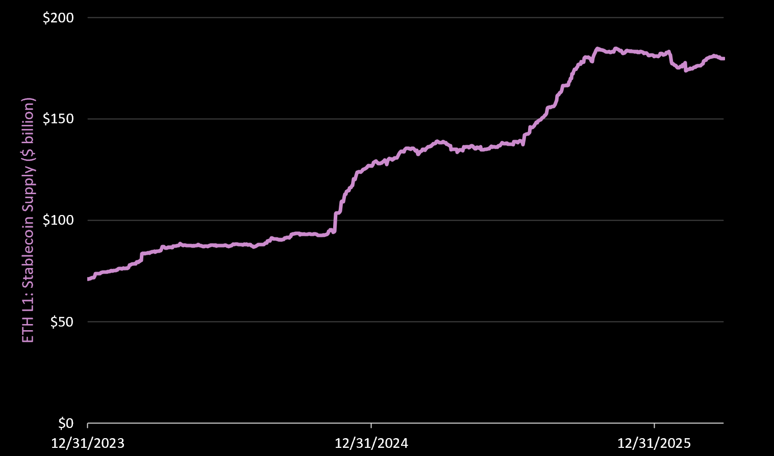 以太坊 L1 上的稳定币总供应量在本季度末达到1800 亿美元,环比下降 0.55%,但同比增长 30%。