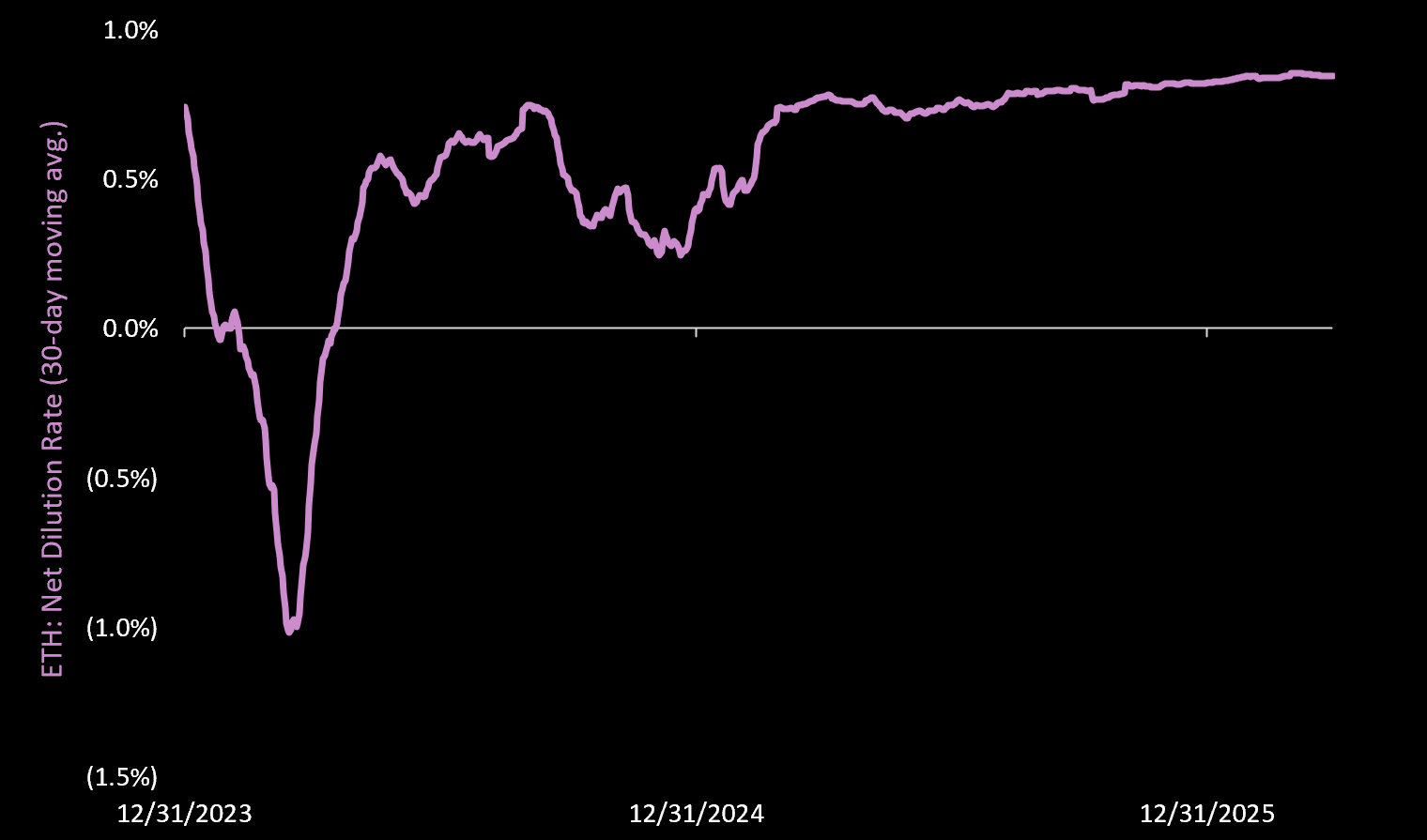净稀释率 = 协议新增发行量 - 被销毁的 ETH/流通供应量(年化)。负的净稀释率有利于 ETH 持有者(价值累积)。正的净稀释率会稀释 ETH 持有者(未质押者)的权益。